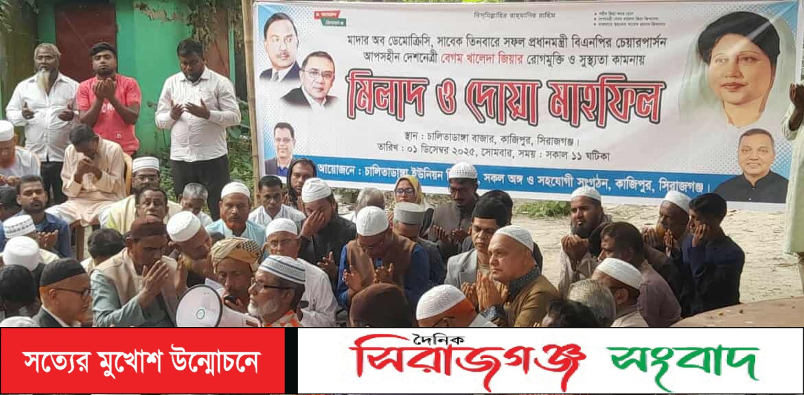 কাজিপুর(সিরাজগঞ্জ) প্রতিনিধিঃ সিরাজগঞ্জের কাজিপুর উপজেলার সোনামুখী ও চালিতাডাঙ্গা ইউনিয়ন বিএনপির আয়োজনে বেগম খালেদা জিয়ার রোগমুক্তি উপলক্ষে এক দোয়ার অনুষ্ঠানের আয়োজন করা হয়। সোমবার বিকেলে অনুষ্ঠিত পৃথক দুটি দোয়ার অনুষ্ঠানে প্রধান অতিথি হিসেবে বক্তব্য রাখেন ও দোয়ায় অংশ নেন সিরাজগঞ্জ-১ আসনে বিএনপির দলীয় মনোনয়ন প্রত্যাশী ও কাজিপুর উপজেলা বিএনপির সাবেক সভাপতি সেলিম রেজা। অনুষ্ঠানে বেগম জিয়ার রোগমুক্তি কামনা করেন অন্যদের মধ্যে কাজিপুর উপজেলা বিএনপির সাবেক সাধারণ সম্পাদক ও কাজিপুর পৌরসভার সাবেক মেয়র প্রভাষক আব্দুস সালাম, যুগ্ন সম্পাদক সাইদুল ইসলাম, আফজাল হোসেন মেমোরিয়াল ডিগ্রি কলেজের সহকারী অধ্যাপক ওয়াহিদুজ্জামান মিনু, সহকারী অধ্যাপক মোহাতাব উদ্দিন, সোনামুখী ইউনিয়ন বিএনপির সাবেক সভাপতি দোলা সরকার, সহ সভাপতি আব্দুস সালাম তোতা মাস্টার, চালিতাডাঙ্গা ইউনিয়ন বিএনপির সাবেক সভাপতি জয়নাল আবেদীন, মুজিবুর রহমান বক্তব্য রাখেন। পরে ফাতেহা শরীফ পাঠশেষে বেগম জিয়ার আশু রোগমুক্তি কামনা করে বিশেষ মুনাজাত অনুষ্ঠিত হয়।