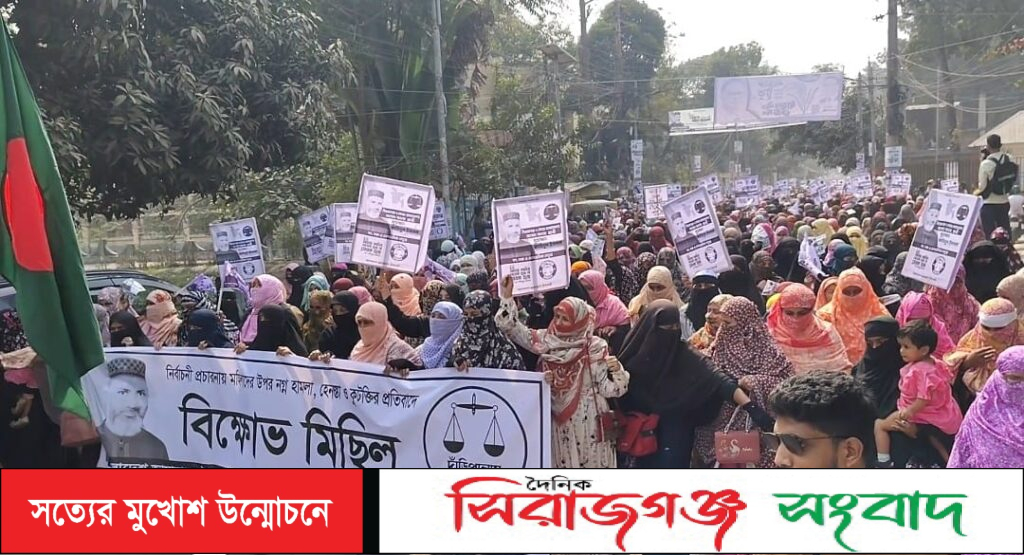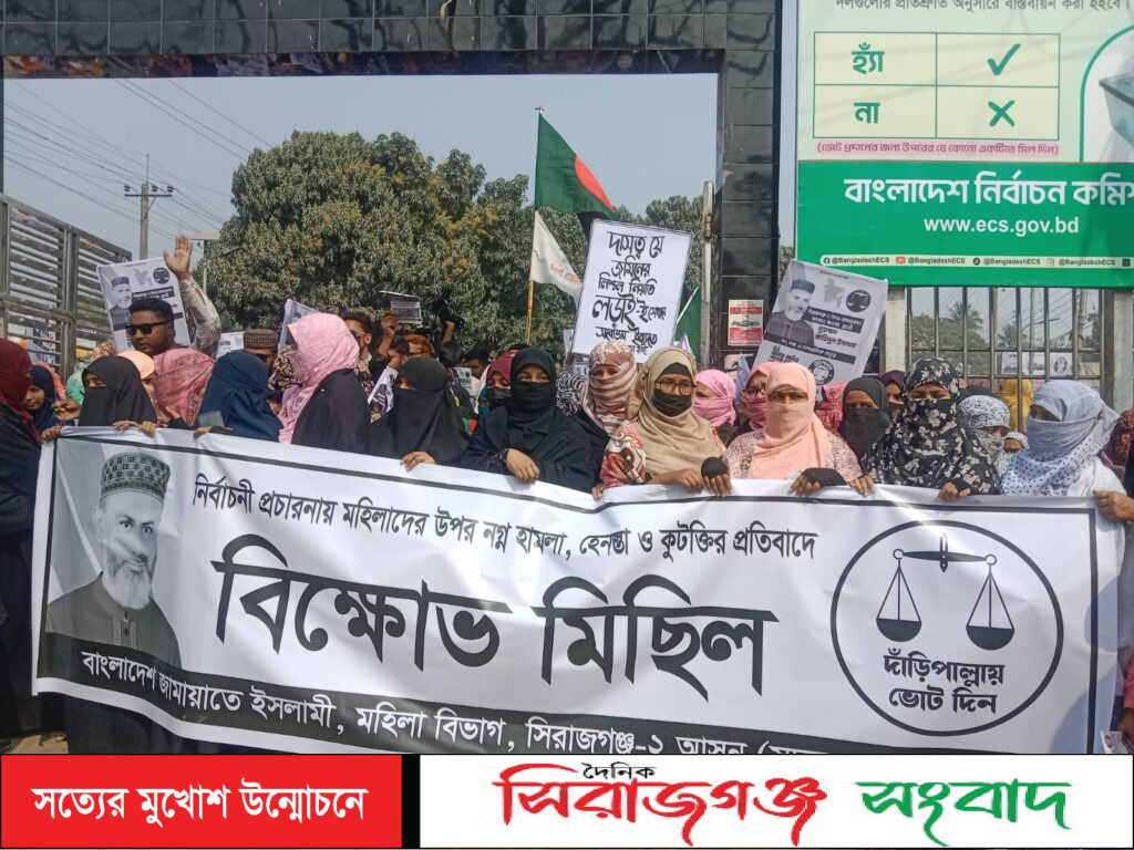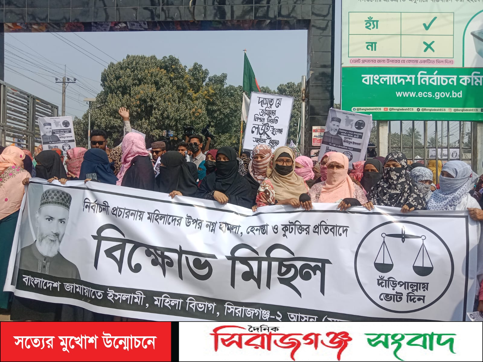 আজ (৪ ফ্রেব্রুয়ারী ২০২৬), সকাল ১১ টায় বাংলাদেশ জামায়াতে ইসলামী সিরাজগঞ্জ-২ আসনের মহিলা বিভাগের উদ্যোগে ত্রয়োদশ জাতীয় সংসদ নির্বাচনে নির্বাচনী প্রচারণায় মহিলাদের নগ্ন হামলা, হেন্তা ও কটুক্তির প্রতিবাদে বিক্ষোভ মিছিল অনুষ্ঠিত হয়।