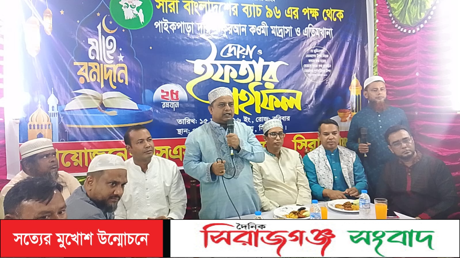 রবিবার (১৫ মার্চ ২০২৬) বাদ আসর পৌর শহরের পাইকপাড়া, বনবাড়ীয়া, সিরাজগঞ্জে সারা বাংলাদেশের এ ৯৬ ব্যাচ এর আয়োজনে আলোচনা সভা দোয়া ও ইফতার মাহফিল অনুষ্ঠিত হয়। অনুষ্ঠানে প্রধান অতিথি হিসেবে উপস্থিত থেকে মাহে রমজানের তাৎপর্য শীর্ষক বক্তব্য রাখেন এসএসসি ৯৬ ব্যাচের ছাত্র এবং সিরাজগঞ্জ জেলা প্রশাসক ও বিজ্ঞ জেলা ম্যাজিস্ট্রেট মোঃ আমিনুল ইসলাম।