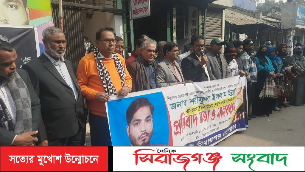 সিরাজগঞ্জ প্রেসক্লাবের সাধারণ সম্পাদকের বাড়িতে পেট্রোল বোমা নিক্ষেপের প্রতিবাদে মানববন্ধন কর্মসূচি পালন