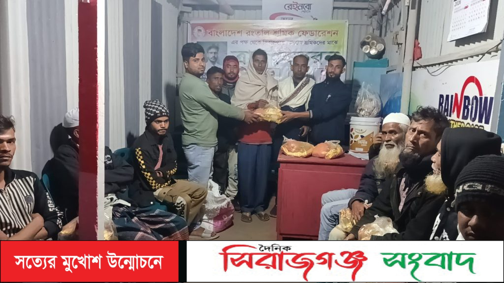 সিরাজগঞ্জে অসহায় ও দুস্থ শ্রমিকদের পাশে দাঁড়িয়েছে বাংলাদেশ রংতুলি শ্রমিক ফেডারেশন। সংগঠনটির সিরাজগঞ্জ জেলা শাখার উদ্যোগে আজ বুধবার (১৪ জানুয়ারি) সন্ধ্যা ৭টার দিকে স্থানীয় কার্যালয় প্রাঙ্গণে এক বিশেষ অনুষ্ঠানের মাধ্যমে এই খাদ্য সামগ্রী উপহার হিসেবে প্রদান করা হয়।
