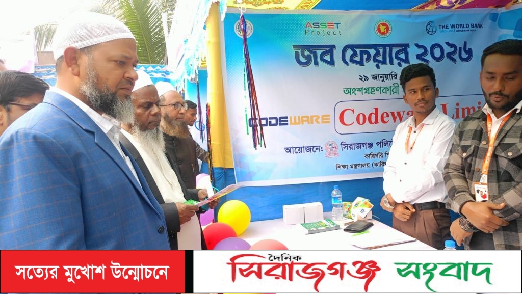 কারিগরি দক্ষতায় সমৃদ্ধি” এই প্রতিপাদ্যকে সামনে রেখে সিরাজগঞ্জের সুনামধন্য ঐতিহ্যবাহী শিক্ষা প্রতিষ্ঠান সিরাজগঞ্জ পলিটেকনিক ইনস্টিটিউটে দিনব্যাপী জব ফেয়ার মেলায় ২০ টি স্টলে বিভিন্ন ব্যবসায় প্রতিষ্ঠানের অংশগ্রহণে উৎসাহ উদ্দীপনার সঙ্গে ” জব ফেয়ার মেলা অনুষ্ঠিত হয়েছে।