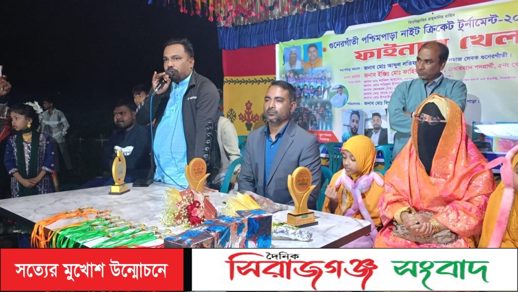 মোঃ হোসেন আলী (,ছোট্ট) : মাদক ছাড়ো, মাঠে চলো—খেলাধুলাই শক্তি, খেলাধুলাই বল ” এই প্রতিপাদ্যকে সামনে রেখে সিরাজগঞ্জ সদর উপজেলা খোকশাবাড়ী ইউনিয়নের গুনেরগাঁতী পশ্চিমপাড়া নাইট ক্রিকেট টুর্নামেন্টে ফাইনাল খেলা ও পুরস্কার অনুষ্ঠিত হয়েছে।