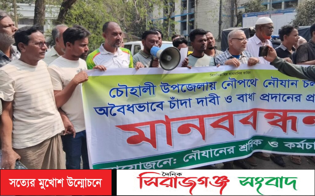 সিরাজগঞ্জে নৌপথে চাঁদাবাজি ও হামলার প্রতিবাদে মানববন্ধন ও স্মারকলিপি প্রদান